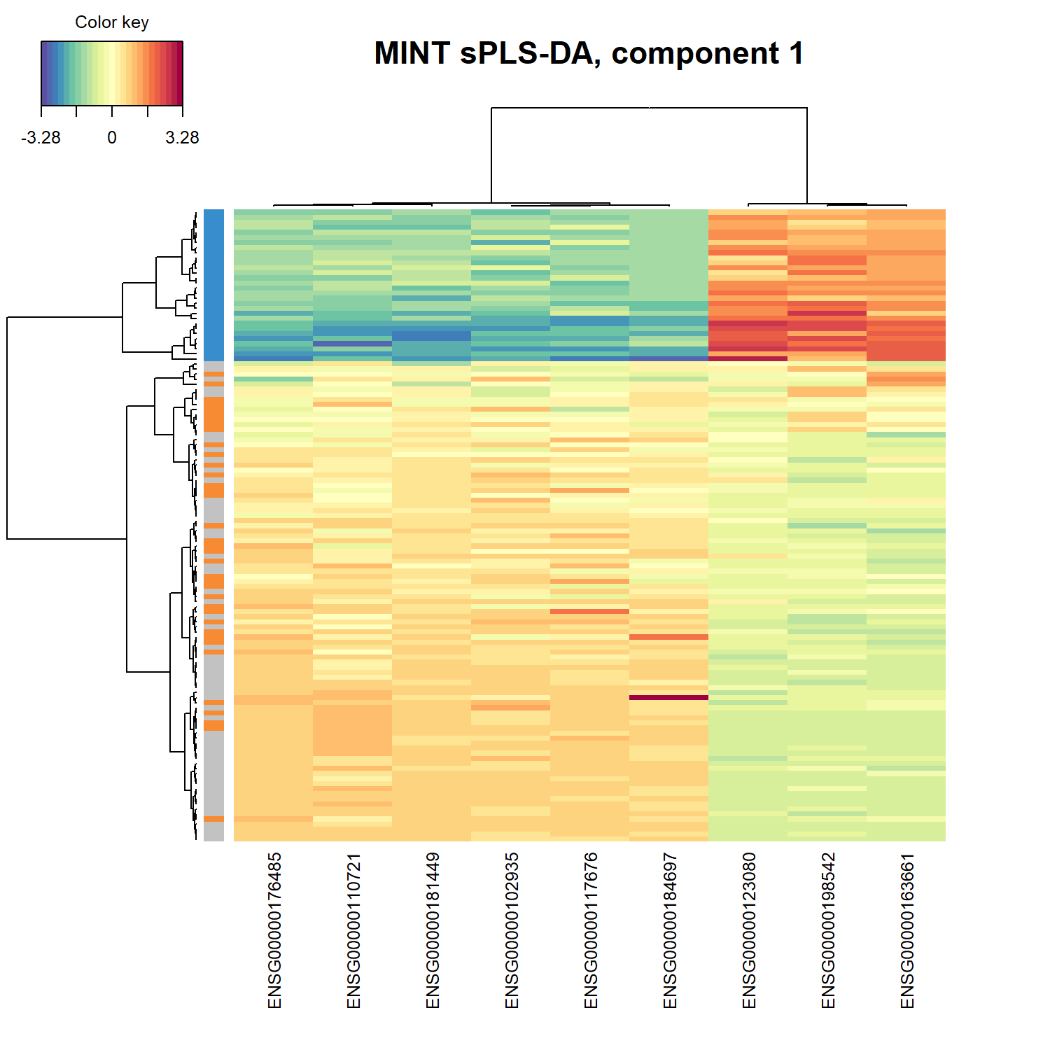 row.sideColors = color.mixo(as.numeric(Y)), row.names = FALSE,