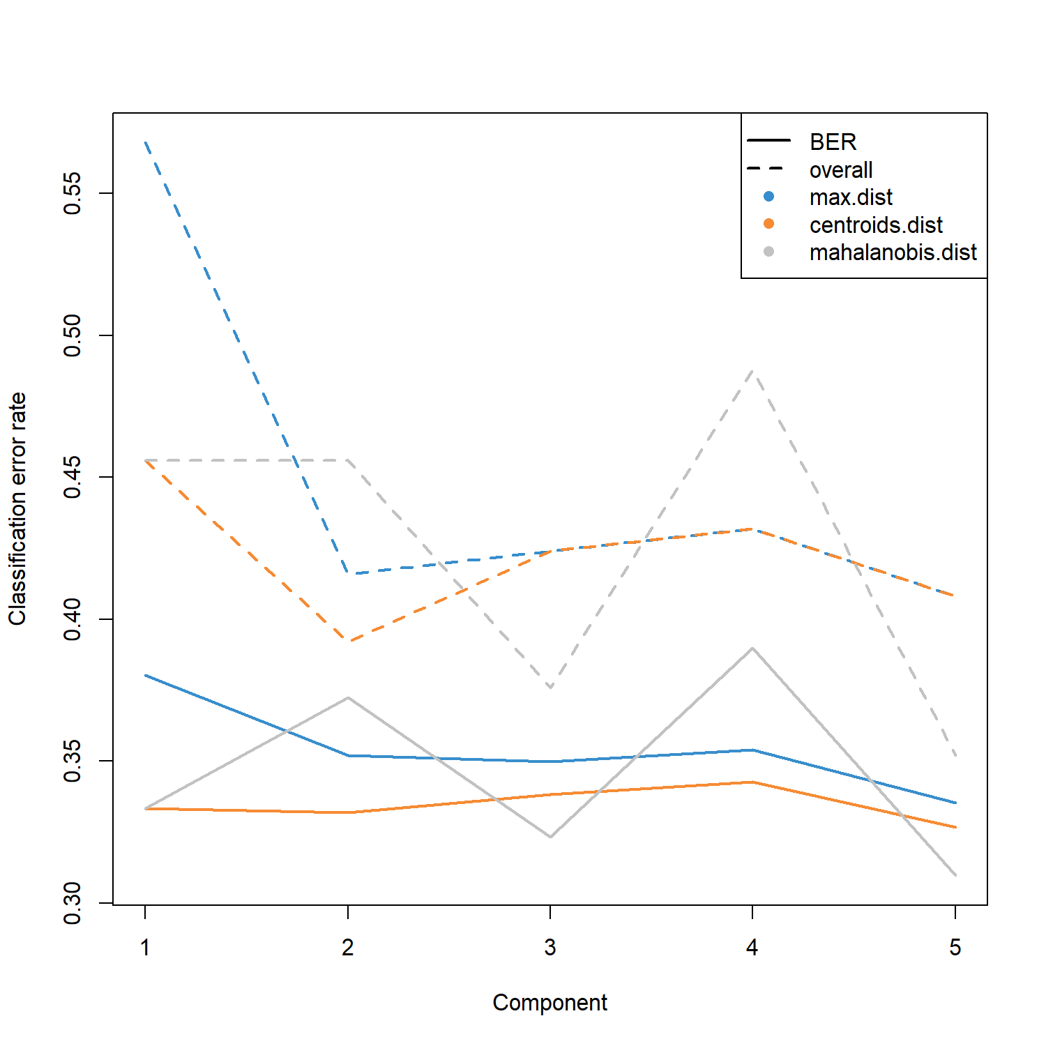 dev.off()perf() 同時會提供多種距離方法(如 max.dist、centroids.dist、mahalanobis.dist)下的最佳 component 數量建議,並根據 overall error rate 與 Balanced Error Rate (BER) 進行評估。