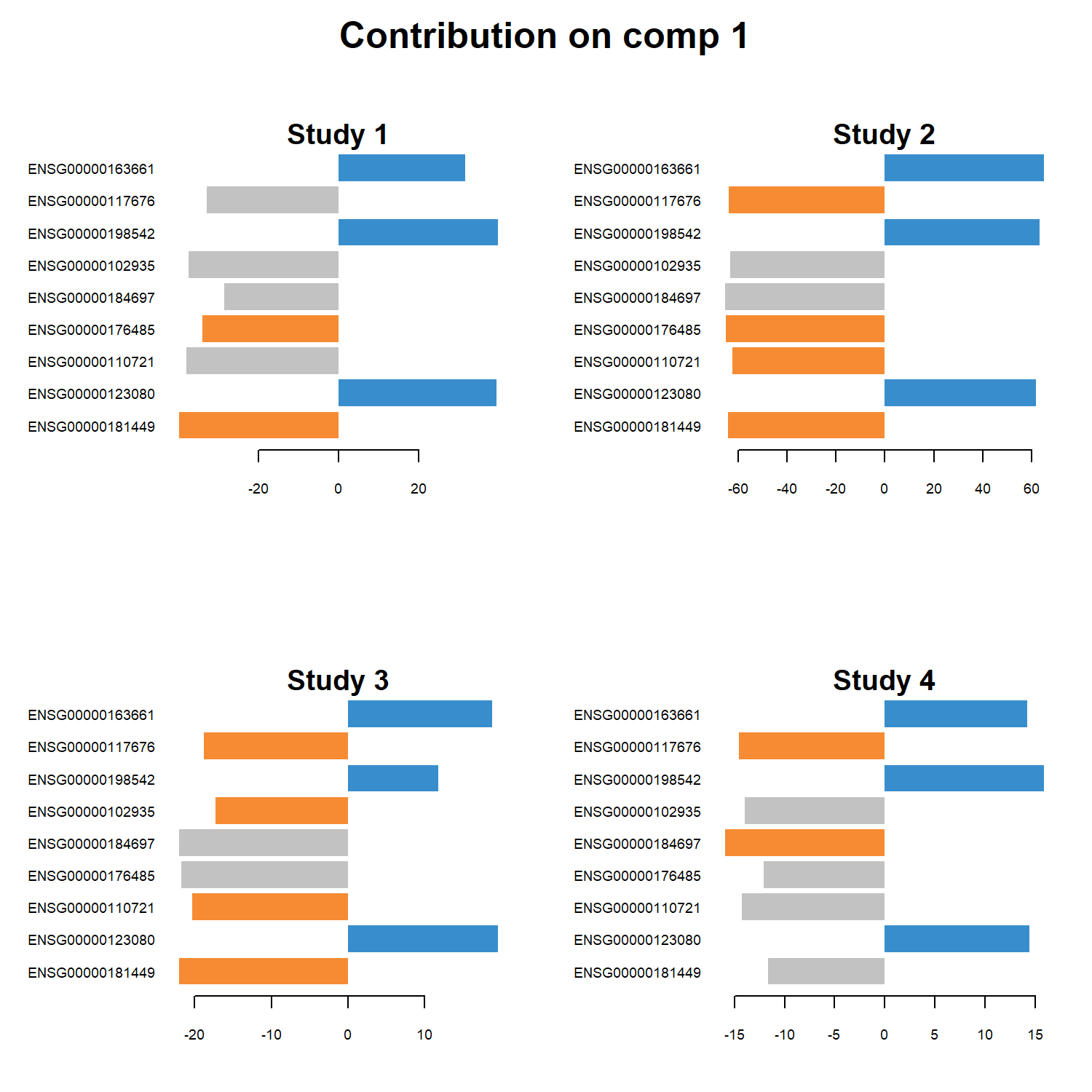 study="all.partial", legend=FALSE, title="Contribution on comp 1",