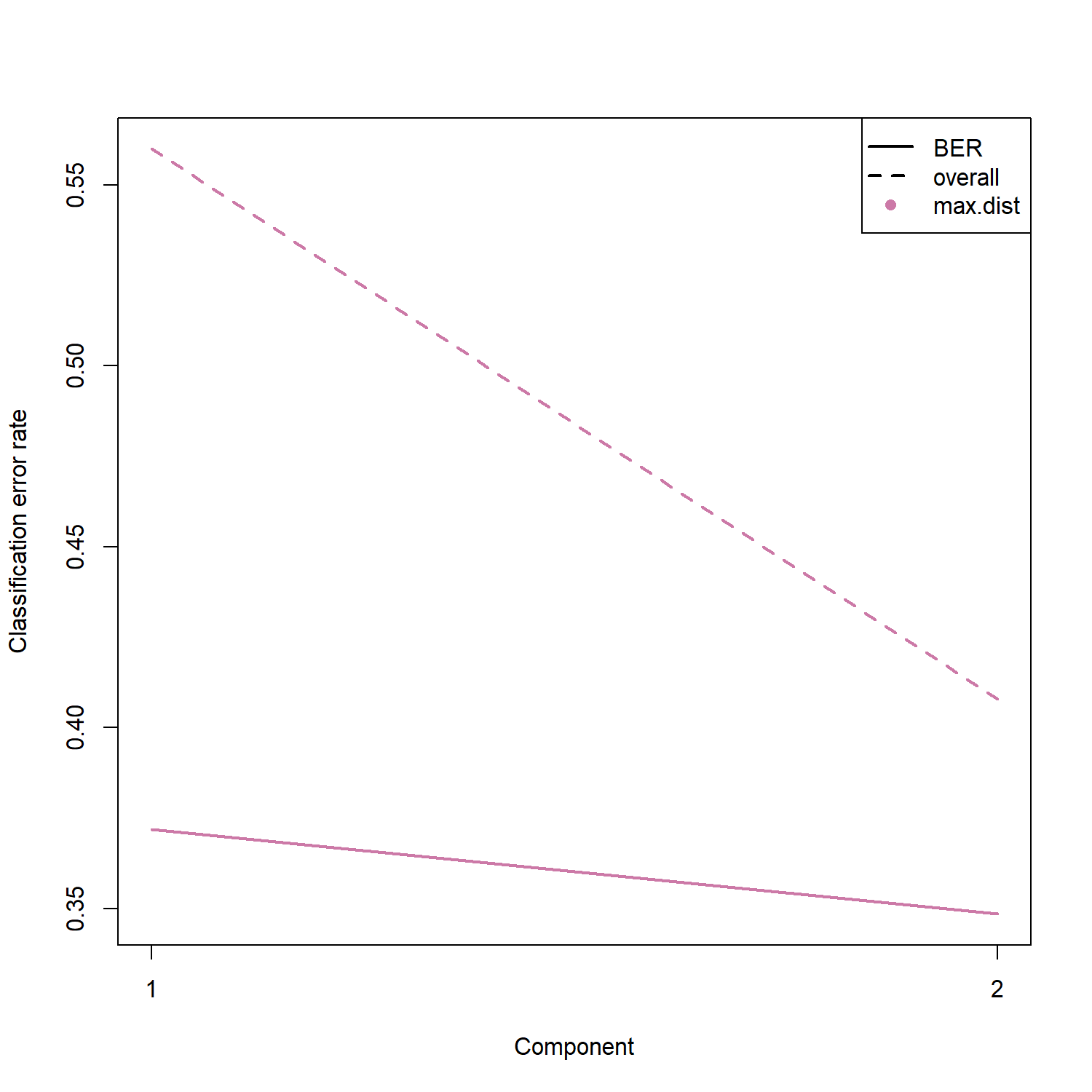 plot(perf.mint) 可將模型在不同 component 數量下的分類錯誤率視覺化,幫助觀察模型表現隨 component 增加的變化情形。圖中通常會顯示 Overall Error Rate 與 Balanced Error Rate (BER) 的變化趨勢,以評估模型是否因增加 component 而改善分類能力。