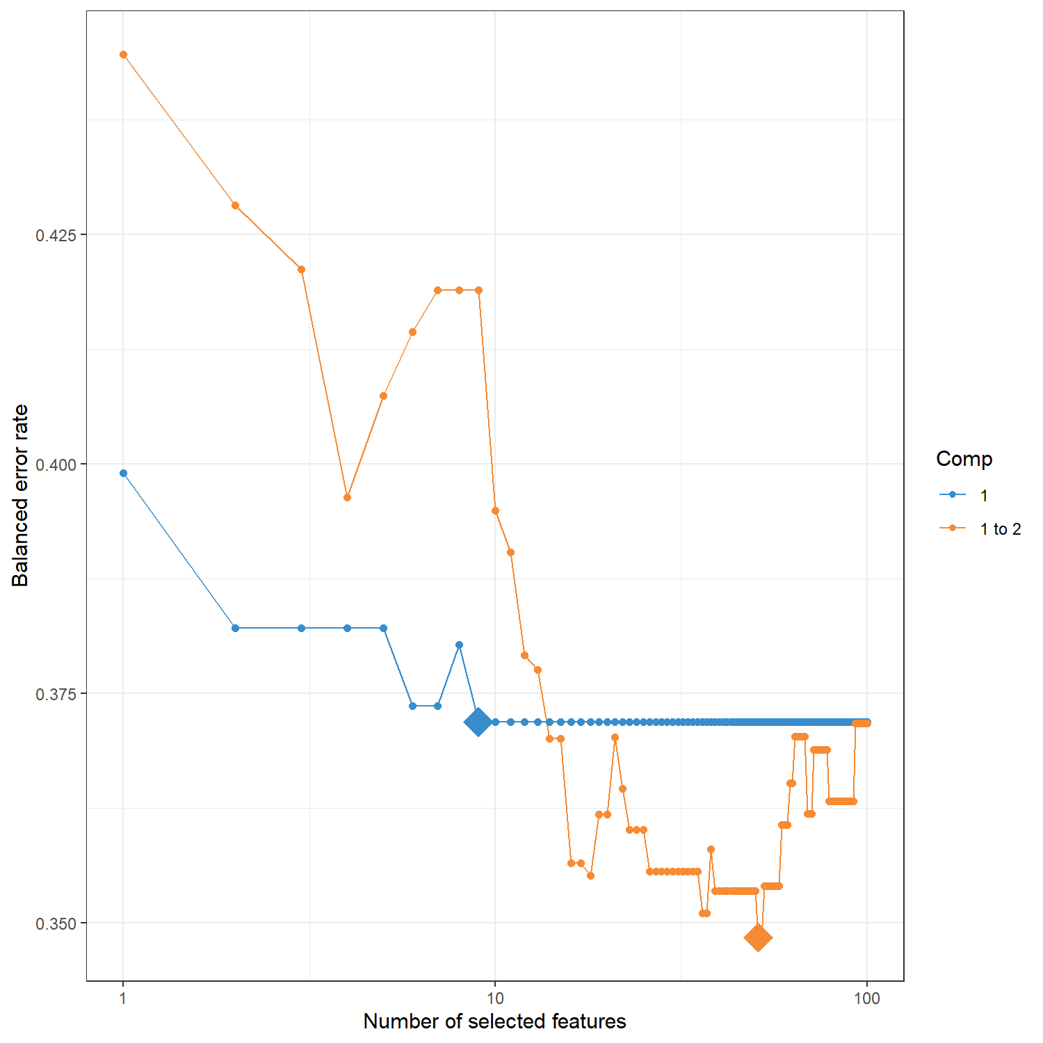 在特徵數量調整完成後,可以利用 plot() 函式將 不同 keepX 設定下的模型表現 視覺化。圖中顯示每個 component 在不同特徵數量時的 Balanced Error Rate (BER),有助於觀察錯誤率隨特徵數量變化的趨勢,並確認最佳的特徵選擇結果。