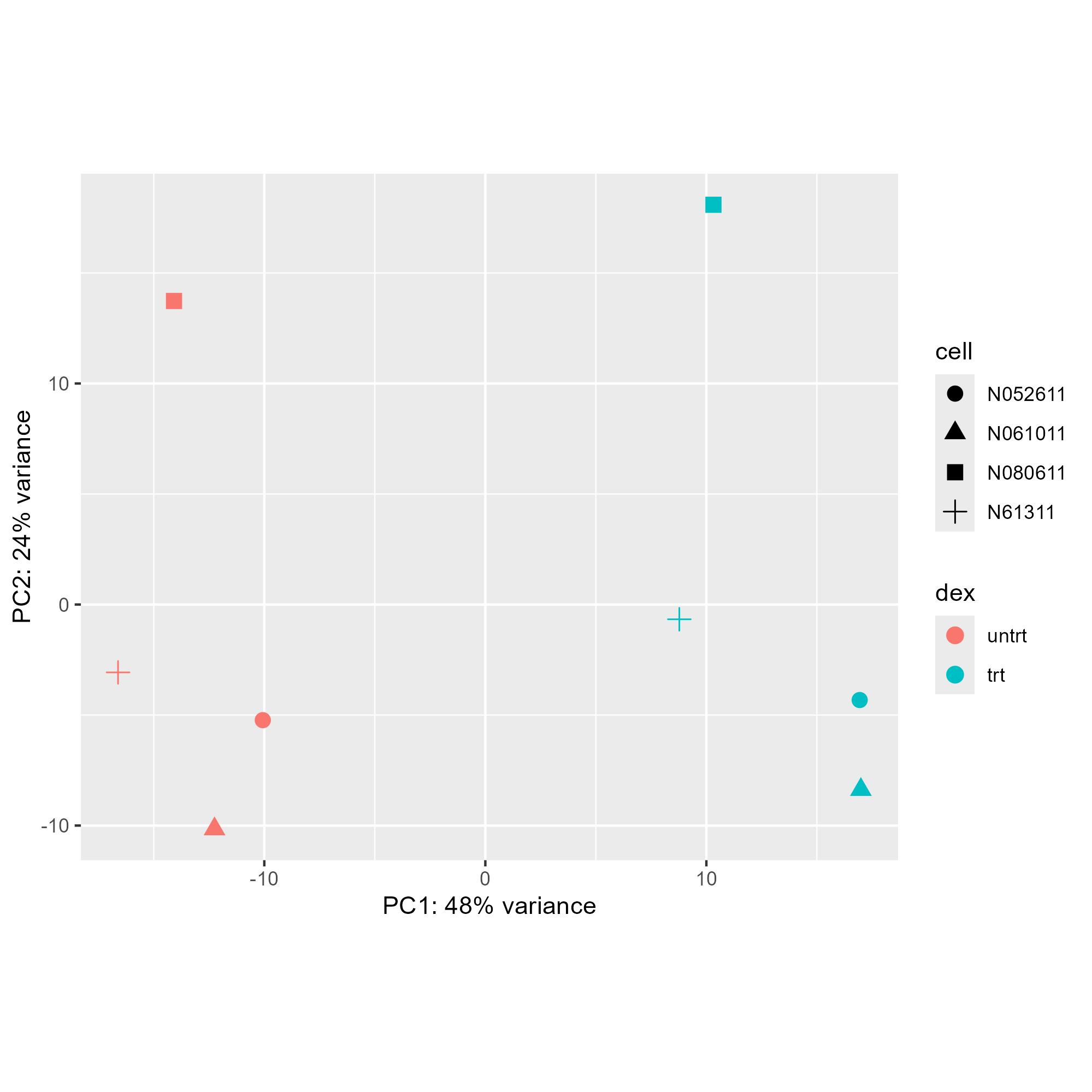 head(coef(dds)) Intercept cell_N061011_vs_N052611 cell_N080611_vs_N052611 cell_N61311_vs_N052611 dex_trt_vs_untrt
